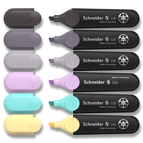 Plochý zvýrazňovač Schneider Job s víčkem v barvě inkoustu v soupravě 6 pastelových barvy.