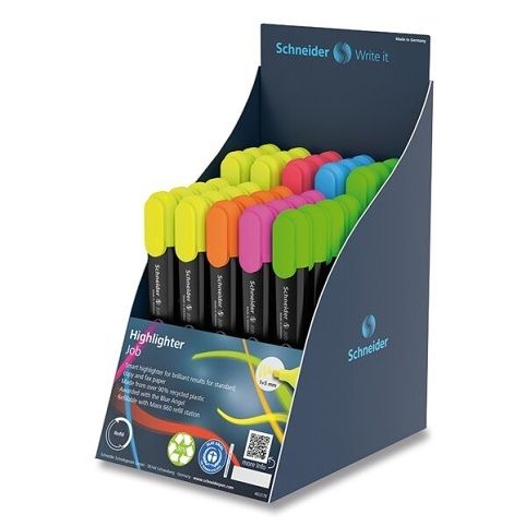 Stojánek s 85 ks plochého zvýrazňovače Schneider Job s víčkem v barvě inkoustu. Stojánek obsahuje 35 ks vmixu 6 barev (14x žlutá, 7x zelená, 4x oranžová, 4x růžová, 3x červená, 3x modrá) + 50 dodatečných kusů v mixu 2 barev – 30x žlutá a 20x zelená.